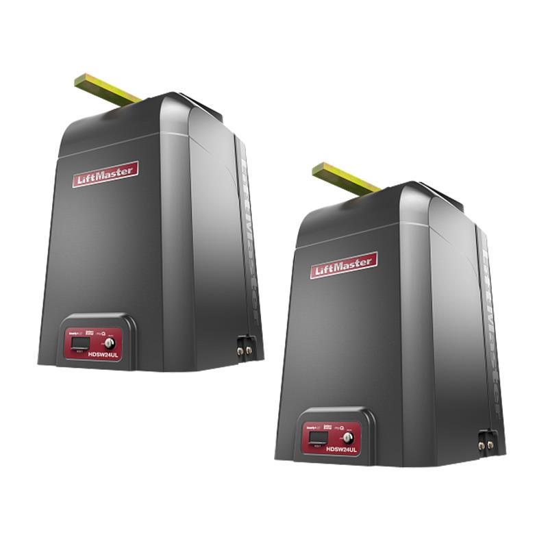 LiftMaster HDSW24UL 24VDC Heavy Duty Variable Speed Dual Swing Gate Operator Kit The LiftMaster HDSW24UL Dual Swing Heavy Duty Variable Speed Gate Operator is designed to meet a range of application needs, with an adjustable opening time from 13 to 36 seconds for a 90-degree swing. Ideal for heavy gates and extreme applications, it supports gates weighing up to 4,500 lbs. or up to 22 feet in length. The direct-drive gearbox and brushless DC motor ensure continuous-duty operation, capable of up to 6 million cycles. Four programmable auxiliary relays provide additional customization options for accessories. The included standard arm moves gates up to 2,800 lbs. An optional custom-reinforced long arm (sold separately) can move gates up to 4,500 lbs. The operator can synchronize gate movement via wireless dual-gate communication, eliminating the need for costly trenching and allowing independent speed adjustment if required. Safety features, such as quick close and anti-tailgate, help secure property and prevent unauthorized access. The PosiLock feature automatically closes the gate when it is pushed past the closed limit. This UL-listed gate operator includes a monitored safety entrapment protection device. myQ Technology allows for full monitoring and control over community and facility access points, as well as remote operation of the gate from anywhere. A cellular data or Wi-Fi connection is required to use myQ technology. The built-in reversing sensor detects obstructions and reverses the gate if necessary. The radio receiver supports up to 50 remote controls for gate operation, and the system is compatible with HomeLink version 4.0 or higher. Installation and troubleshooting are made easier with the LED diagnostic display.